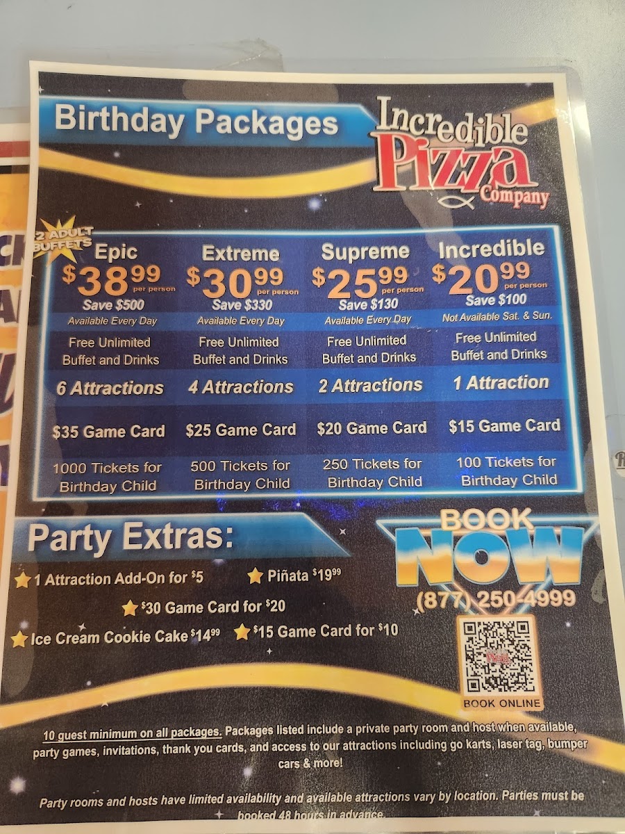 Welcome to Tulsa Incredible Pizza Company, where family entertainment meets delicious dining! Located at 8314 E 71st St, Tulsa, OK, this vibrant venue offers a fun-filled atmosphere for all ages. The menu features a tempting selection of pizzas perfect for a variety of tastes, with prices starting at just $5 for cheese or one topping. Indulge in their all-you-can-eat buffet, which includes not only pizza but also pasta, salad, hot dogs, and desserts.